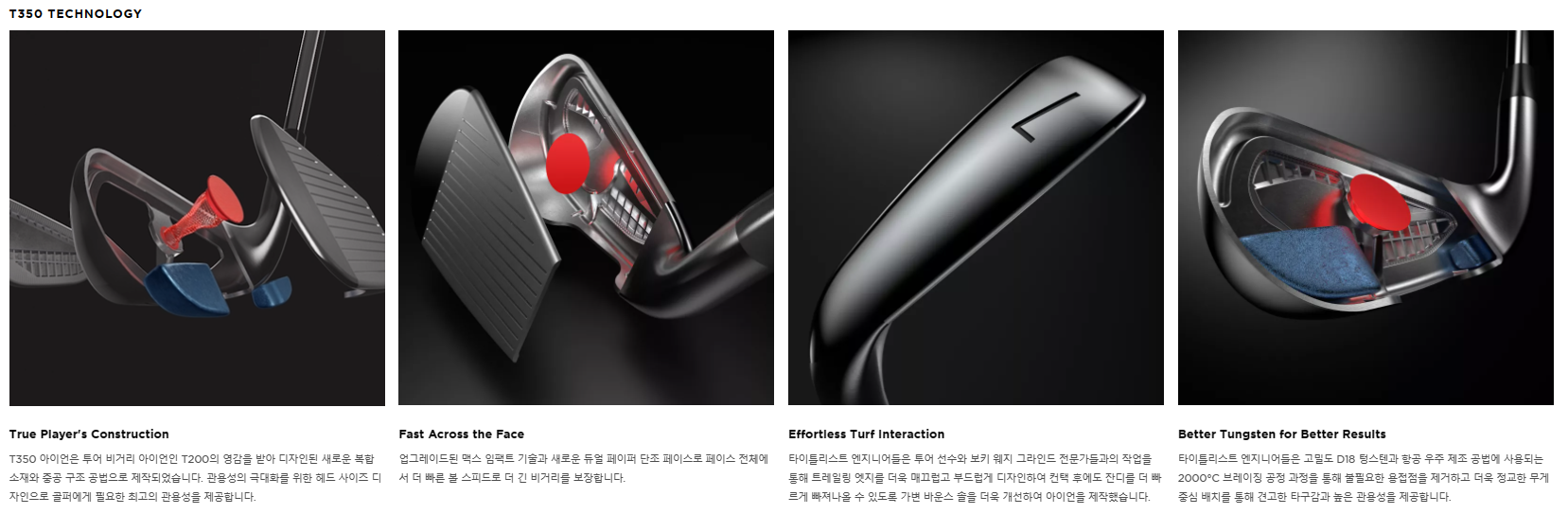 진정한 플레이어용 구성 T350 아이언은 T200의 투어 비거리 아이언에서 영감을 받아 디자인된 새로운 복합 소재와 중공 구조 공법으로 제작되었습니다. 골퍼에게 필요한 최고의 관용성을 제공하기 위해 헤드 사이즈 디자인이 최적화되었습니다.